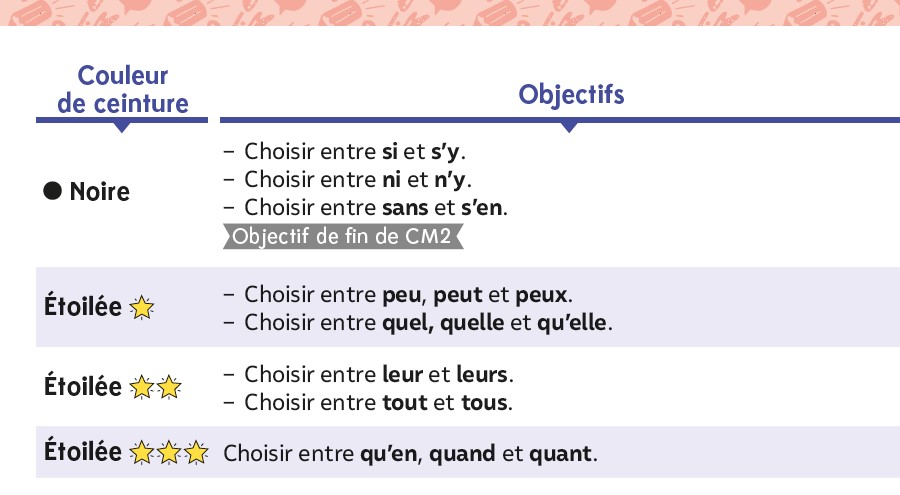 - Jaune : son/sont (un seul test pour ces deux premières ceintures)