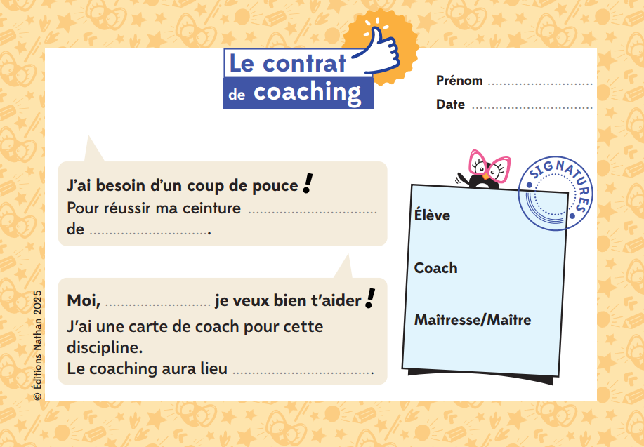 Les élèves qui ont besoin d’aide choisissent leur coach (en regardant les cartes au fond de la classe) et vont le solliciter. Ils signent un petit contrat qui sera, lui aussi, affiché en fond de classe. Le coach passera alors environ 20 minutes par semaine avec son élève, sur la discipline choisie, en vue de l’aider à réussir un test de ceinture.