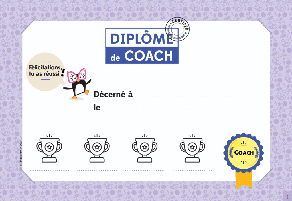 Certains élèves se prennent au jeu et sont très doués pour accompagner et motiver leurs camarades, donc les 4 coupes du diplôme sont vite coloriées… Ainsi, au cinquième élève coaché qui réussit sa ceinture, je décroche le diplôme, je le roule avec soin, l’élève l’emporte chez elle/lui et… j’affiche pour elle ou pour lui le diplôme suivant, le diplôme de coach confirmé. J’ai ainsi 10 niveaux de diplômes : coach expert, coach d’élite, coach légendaire… Ils ont un petit numéro en bas à droite, pour ne pas me tromper d’ordre. Pour le dernier, le coach suprême, (que je n’ai donné qu’une seule fois), je ne colorie plus de coupes, je colle des petits autocollants étoilés à chaque réussite.